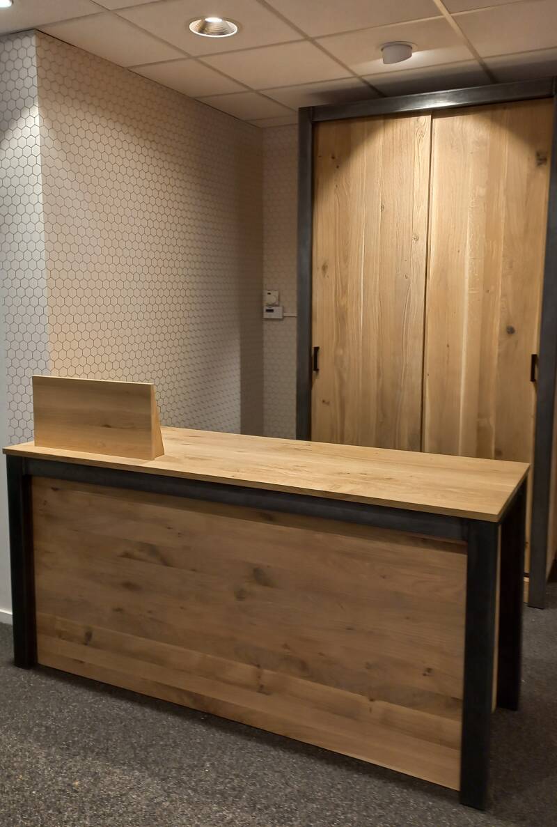 Ontvangstbalie massief eiken met staal. Schuifdeurkast massief eiken. Stalen omlijsting.