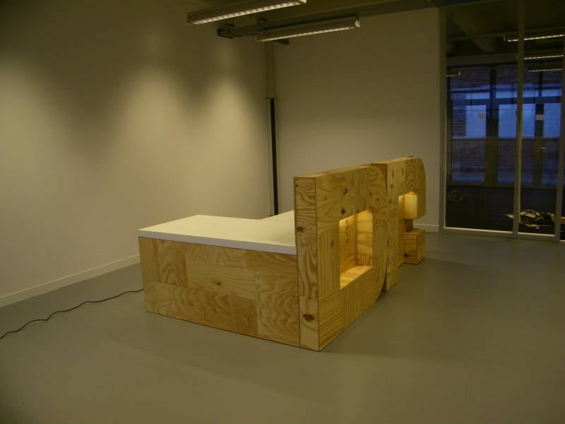 Detail bureau met logo en verlichting.
