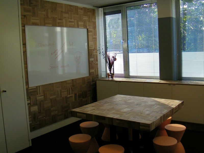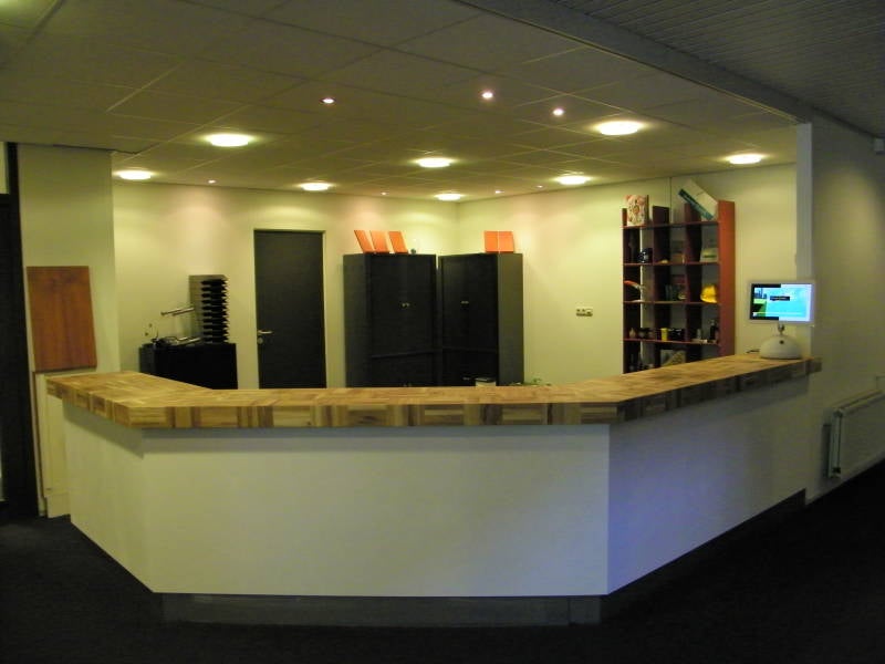 Ontvangstbalie met eiken blokjes.