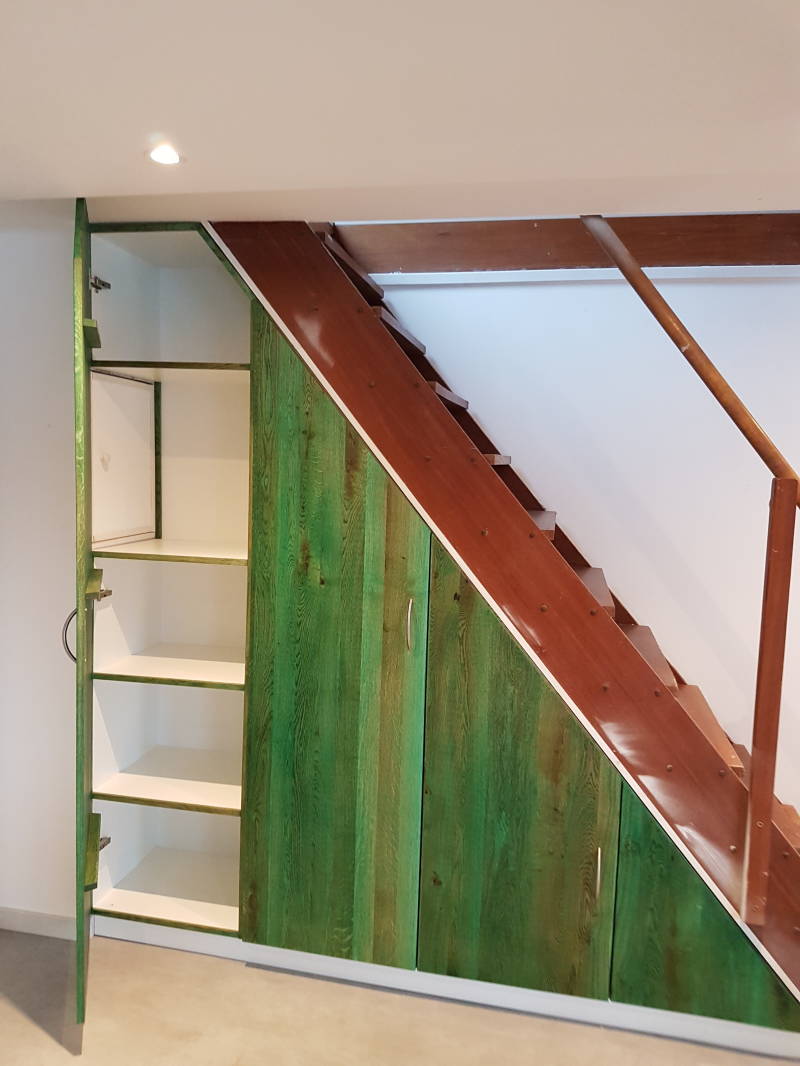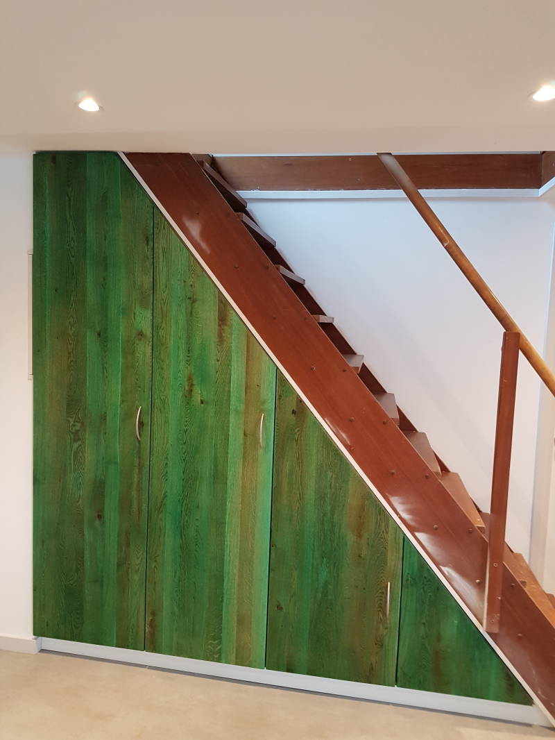 Kast onder trap. Eiken deuren met Rubio monocoat in de kleur emerald.