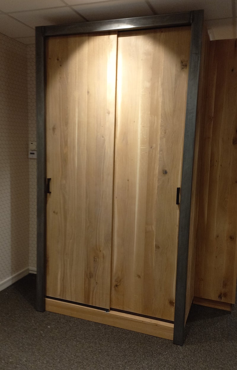 Schuifdeurkast. Massief eiken met stalen omlijsting.