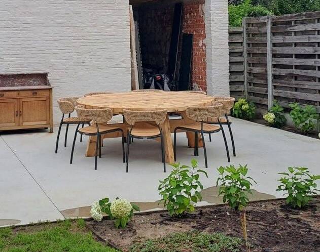 Ronde tuintafel van balken sloophout tot 200 cm .